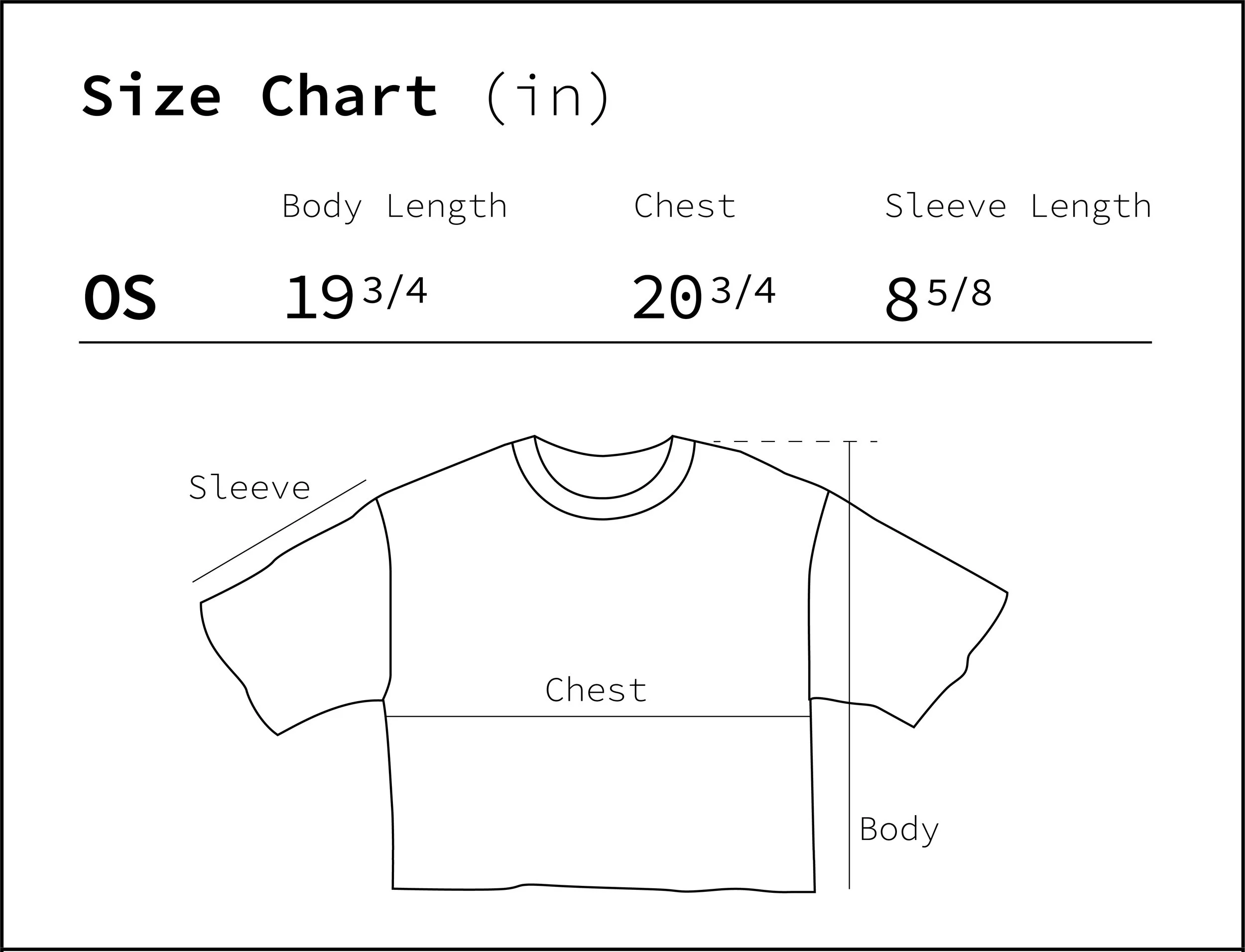 This crop tee comes in one size due to its oversized styling. Please see the size chart below.